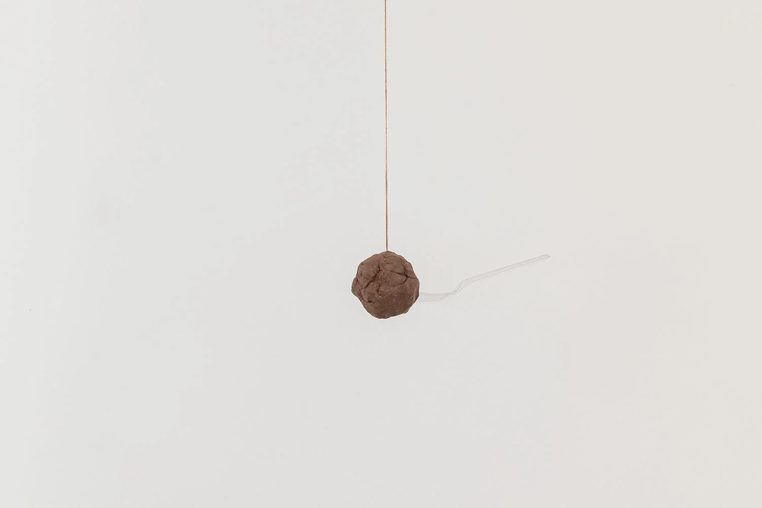 Objet repère, 2022, drisse, argile cru, fourchette en plastique, 8 x 21 x 8 cm